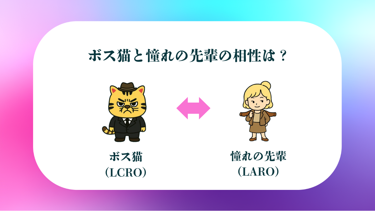 ボス猫(LCRO)と憧れの先輩(LARO)は、「魅力」では強く惹かれ合う一方で、「恋愛の進め方」はズレやすいペアです。